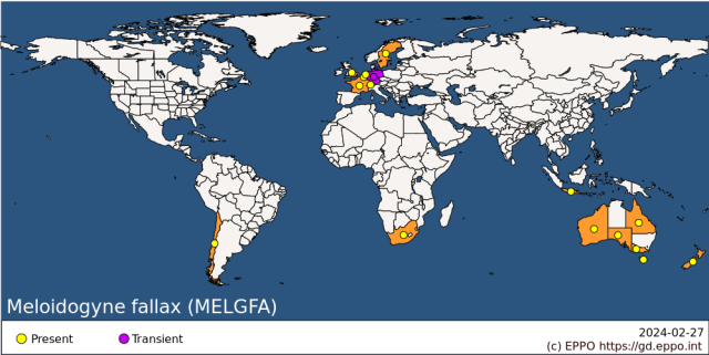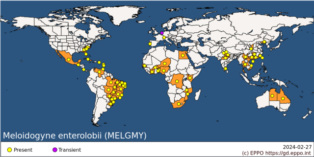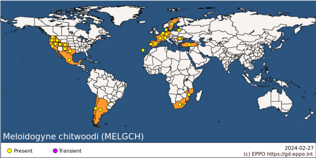 Figuur: Verspreiding van M. chitwoodi (boven), M. fallax (miden) en M. enterolobii (onder) in de wereld (bron: EPPO)