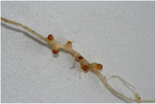 Aantasting van wortel door M. hapla geeft aanleiding tot vertakkingen en de vorming van vele kleine zijwortels (Foto 7).