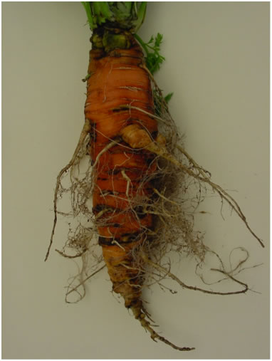 Foto 6: Schade veroorzaakt door Meloidogyne chitwoodi bij wortel (foto Wim Wesemael, ILVO)